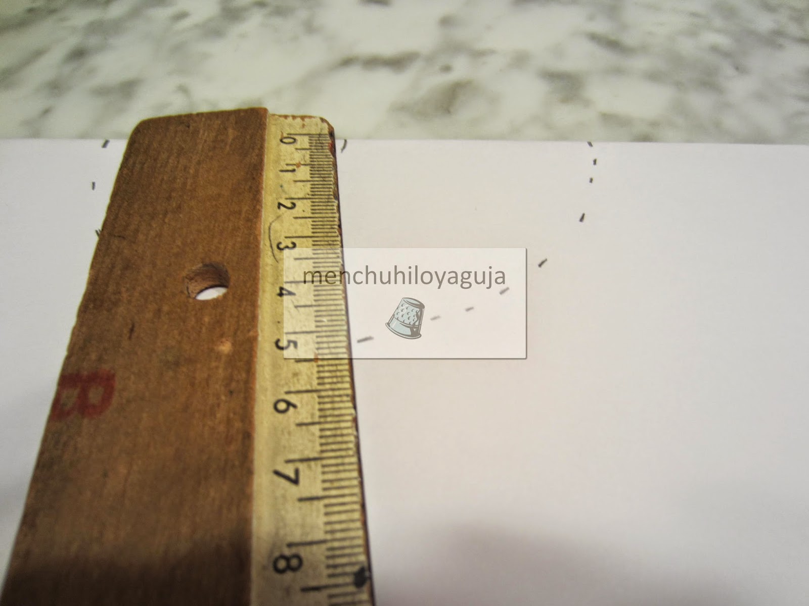 * Traza una línea recta a 1 cm. del borde del papel lo suficientemente larga para poder dibujar la falda y marca el centro de la misma.